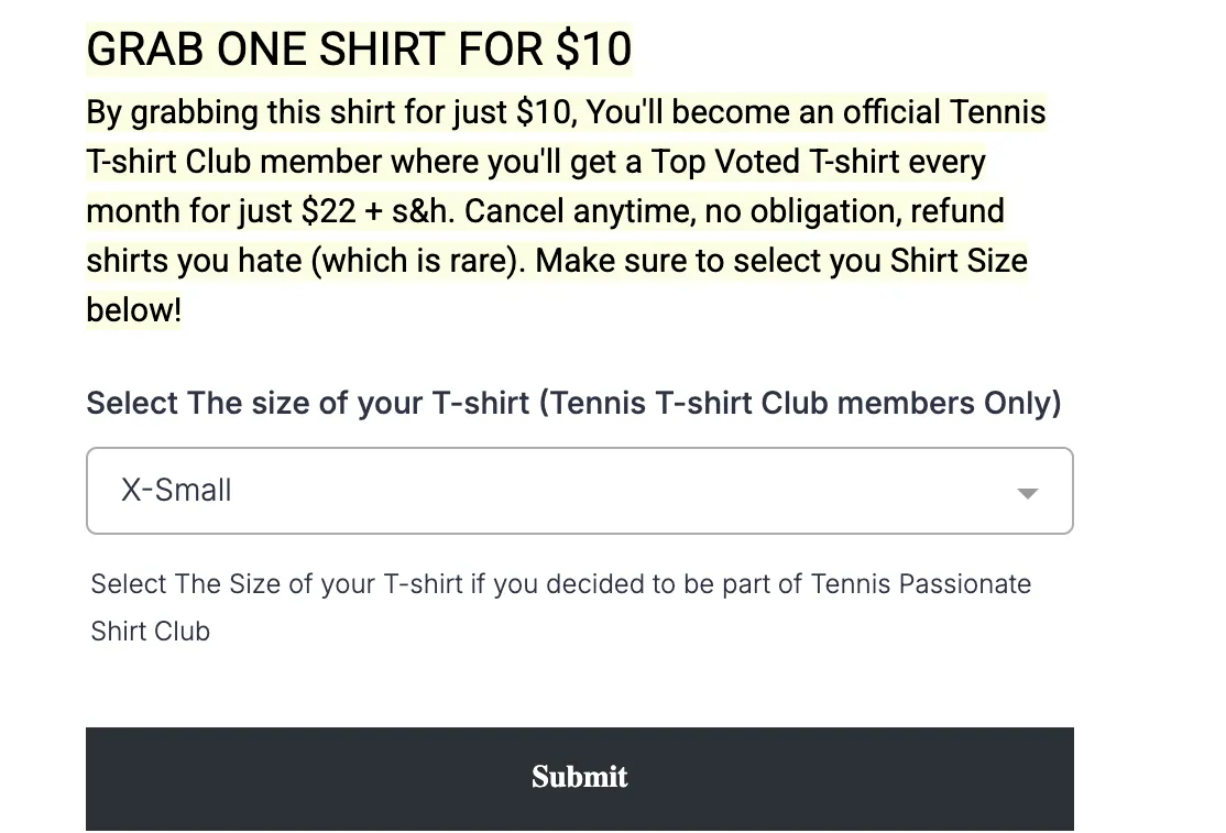 No problem! You’re in control. You can cancel your Tennis Passionate T-Shirt Club subscription anytime. You will get an email with a link to cancel or you can just email ([email protected]) or call (914) 531-3216 us, and we’ll take care of it. No obligations, no hassle.